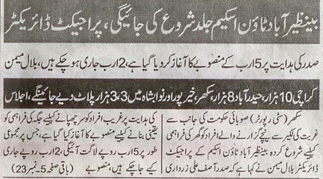 Land measuring 1,000 acres has been allocated by the Govt: of Sindh in Deh Mendiari, Keamari town for Benazir town project.July, 2011